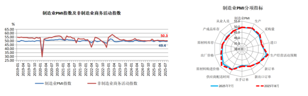 8月份,制造業(yè)采購經(jīng)理指數(shù)(PMI)、非制造業(yè)商務(wù)活動(dòng)指數(shù)和綜合PMI產(chǎn)出指數(shù)分別為49.4%、50.3%和50.5%,分別比上月上升0.1、0.2和0.3個(gè)百分點(diǎn),制造業(yè)景氣水平回落速度放緩,非制造業(yè)商務(wù)活動(dòng)指數(shù)仍高于臨界點(diǎn),我國企業(yè)生產(chǎn)經(jīng)營活動(dòng)總體保持?jǐn)U張。從分項(xiàng)指標(biāo)看,生產(chǎn)指數(shù)為50.8%,環(huán)比回升0.3%;新訂單指數(shù)為49.5%,環(huán)比回升0.1%;新出口訂單指數(shù)為47.2%,環(huán)比微升0.1%。新訂單指數(shù)同生產(chǎn)指數(shù)差值為-1.3%,環(huán)比下降0.2%,反映出當(dāng)前內(nèi)外需繼續(xù)呈現(xiàn)收縮態(tài)勢,且國內(nèi)需求不足的結(jié)構(gòu)性矛盾依然突出,經(jīng)濟(jì)回升向好基礎(chǔ)待鞏固。新出口訂單微升表明隨著中美關(guān)稅暫停期延至11月,雙方關(guān)稅稅率繼續(xù)提升的預(yù)期下降,出口大幅收縮的可能性明顯降低,市場主體對需求的樂觀情緒較7月有邊際好轉(zhuǎn)。